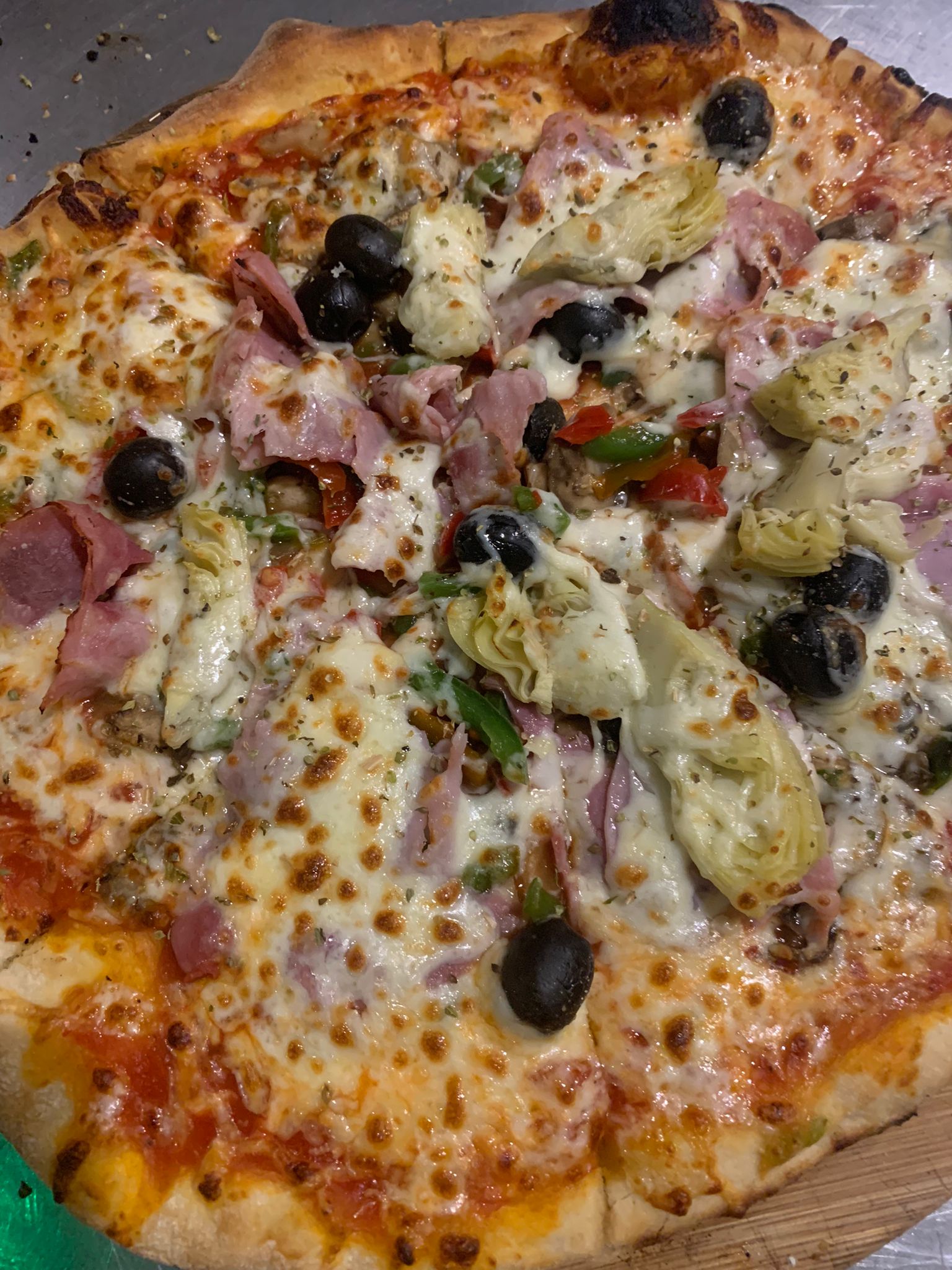 Tomato sauce, Mozza, Emmental, Mushroom, Ham, Peppers, Artichoke, Olives